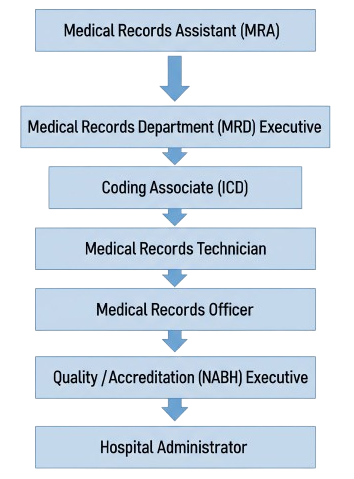 The career journey from Medical Records Assistant (MRA) to Hospital Administrator offers medical students a structured pathway of growth and responsibility. Beginning as an MRA, students gain foundational skills in maintaining patient records and data accuracy. Progressing to roles like MRD Executive and Coding Associate (ICD), they develop expertise in record management, clinical coding, and compliance with healthcare standards. As Medical Records Technicians and Officers, they oversee record systems, ensure confidentiality, and support hospital operations. Transitioning into Quality and Accreditation (NABH) Executive positions, professionals engage in hospital audits, policy implementation, and quality assurance. This cumulative experience ultimately prepares them to step into Hospital Administration, where they lead teams, manage healthcare services, and uphold excellence in patient care and organizational standards.